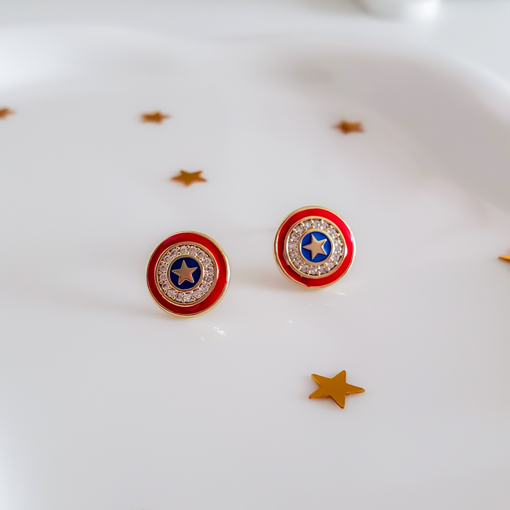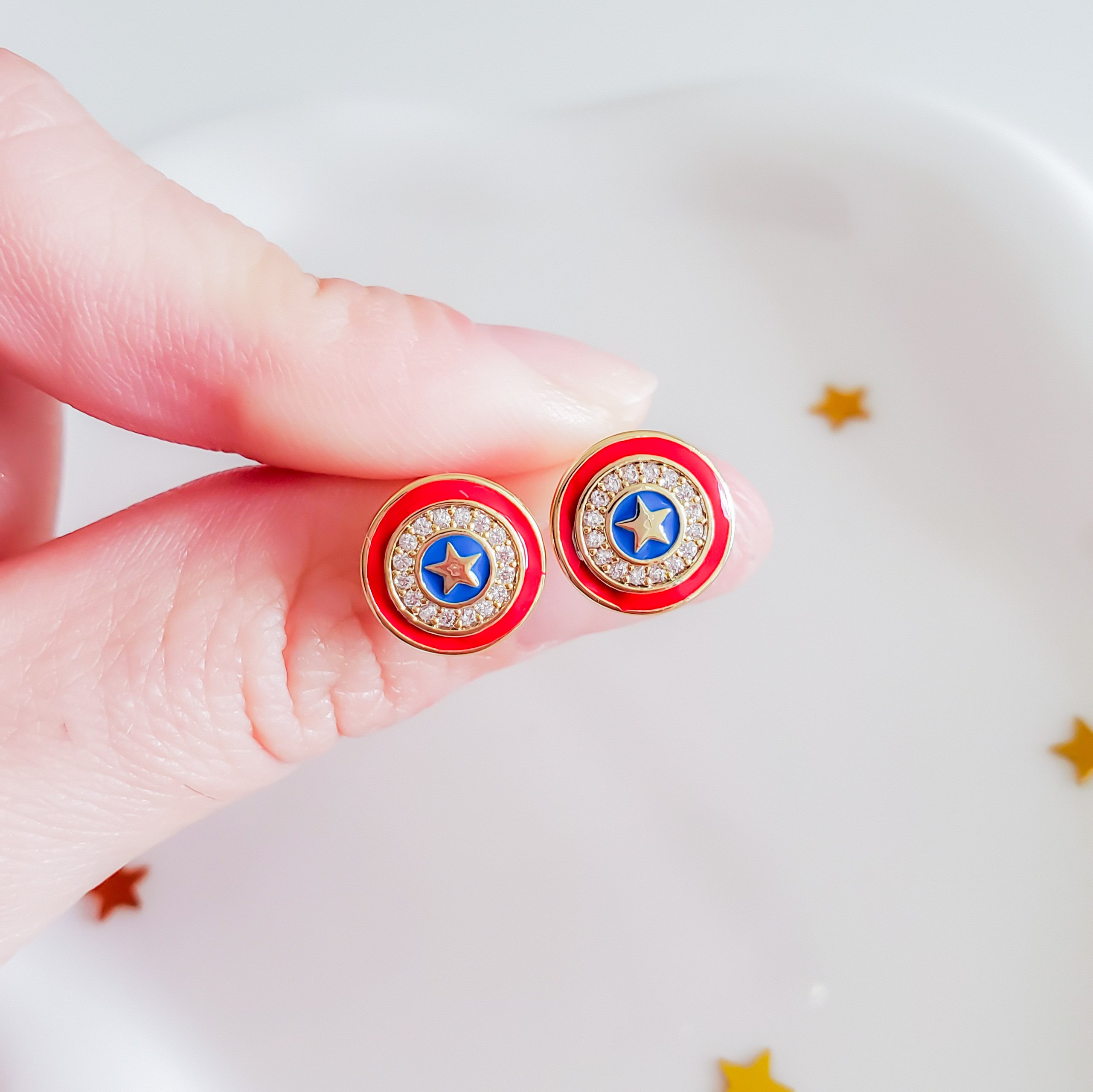 With our Marvel’s Captain America Studs, you can add some Super Hero style to your everyday look. The studs feature Captain America’s iconic shield, with vibrant red, white, and blue enamel detailing that’s sure to make a statement. The glimmering stones that line the hoops add an extra level of chicness, making these earrings a true standout.
