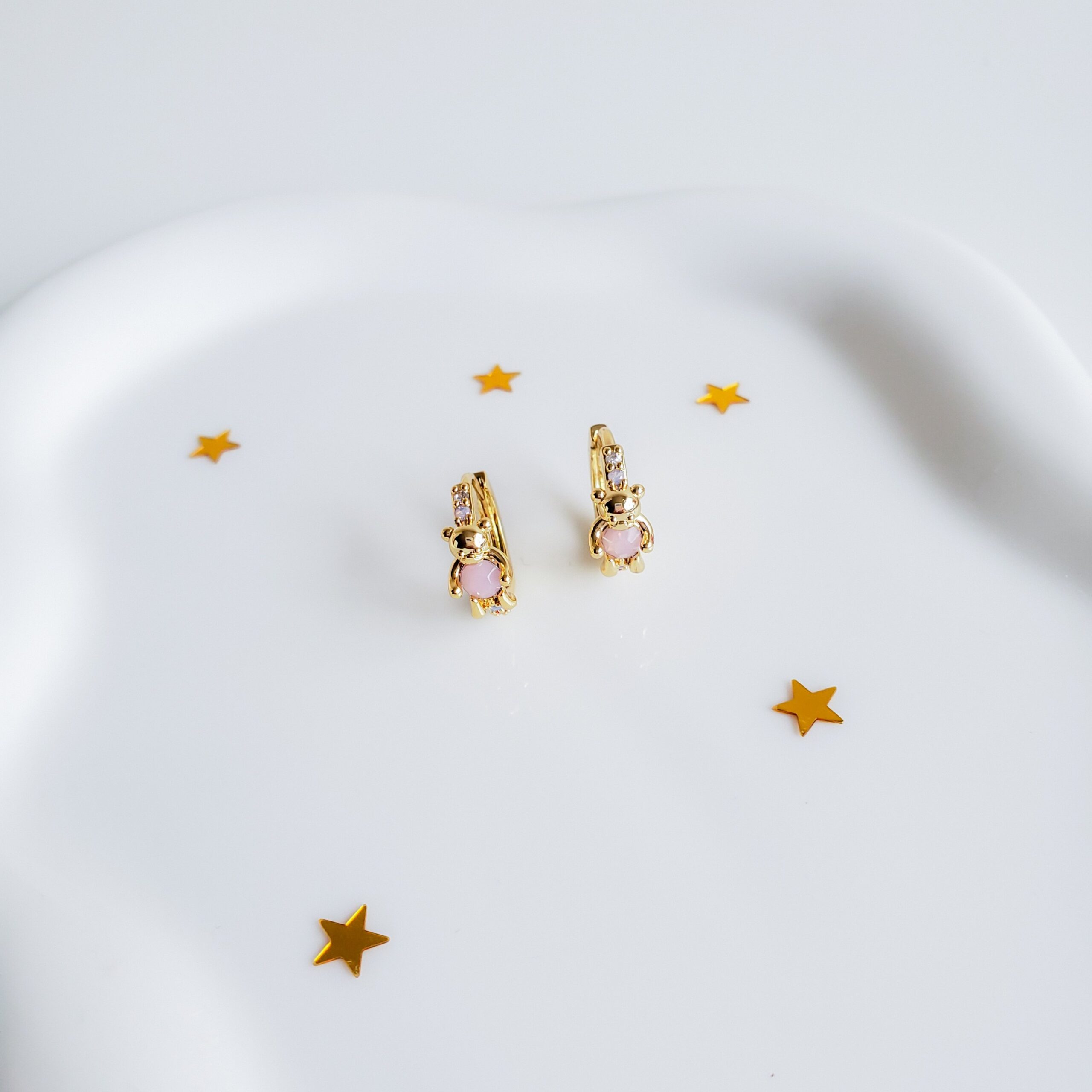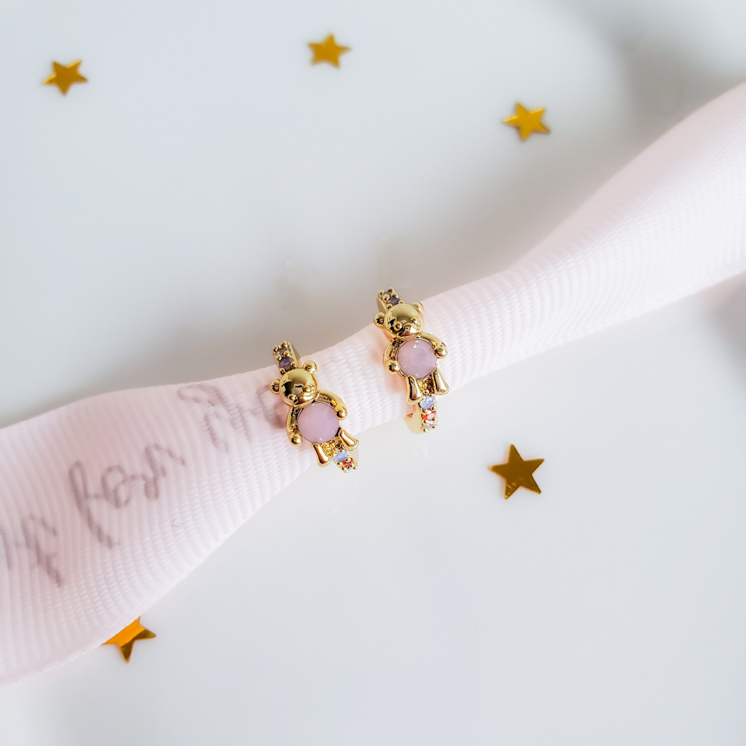 How adorable! Our teddy bear earrings are a dream. Crafted in pastel shades and featuring small hoops, they combine sweet childhood fantasy with delicate gold details, making them the perfect earrings to wear all day long.